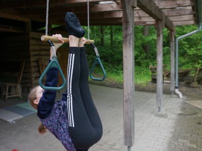 Wir haben uns, je nach Wetterverhältnissen, ein- bis zweimal in der Woche an der Wiese bei der Turnerhütte getroffen. Manchmal waren wir auf dem Waldsportpfad unterwegs und haben Übungen an den dort vorhandenen Geräten gemacht. Bei trockenen Bedingungen haben wir an "Geräten" eingesammelt, was wir und unsere Turnerinnen so zu Hause hatten und haben Sprung, Reck, Balken und Boden auf die Wiese verlegt. Mein Auto war als mobile Turnhalle mit Klappbalken, vielen Matten, einem alten Sprungbrett, einem Trapez als Reck-Ersatz und einem Bodenbarren beladen.