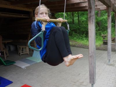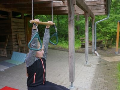 Wir haben uns, je nach Wetterverhältnissen, ein- bis zweimal in der Woche an der Wiese bei der Turnerhütte getroffen. Manchmal waren wir auf dem Waldsportpfad unterwegs und haben Übungen an den dort vorhandenen Geräten gemacht. Bei trockenen Bedingungen haben wir an "Geräten" eingesammelt, was wir und unsere Turnerinnen so zu Hause hatten und haben Sprung, Reck, Balken und Boden auf die Wiese verlegt. Mein Auto war als mobile Turnhalle mit Klappbalken, vielen Matten, einem alten Sprungbrett, einem Trapez als Reck-Ersatz und einem Bodenbarren beladen.